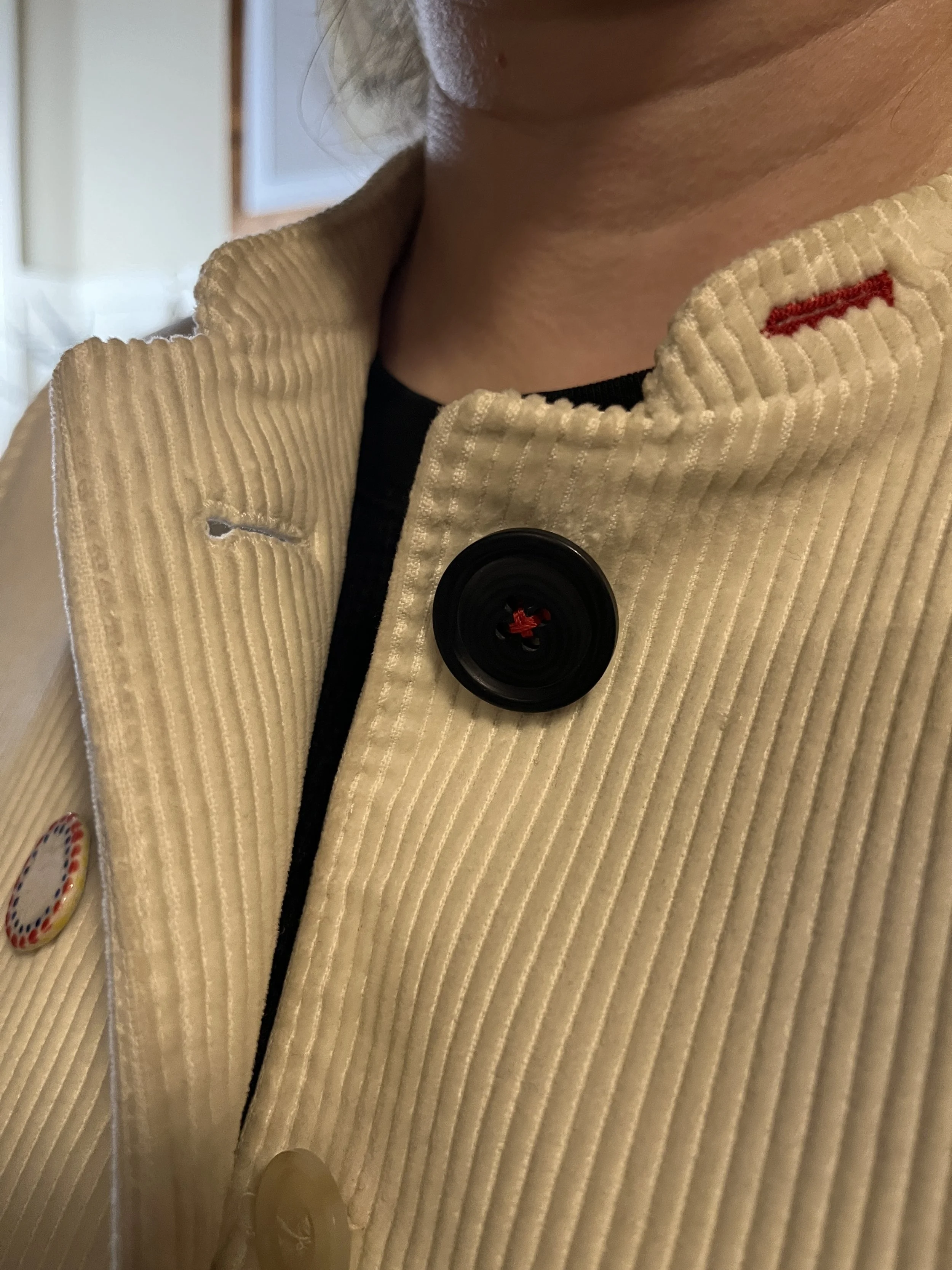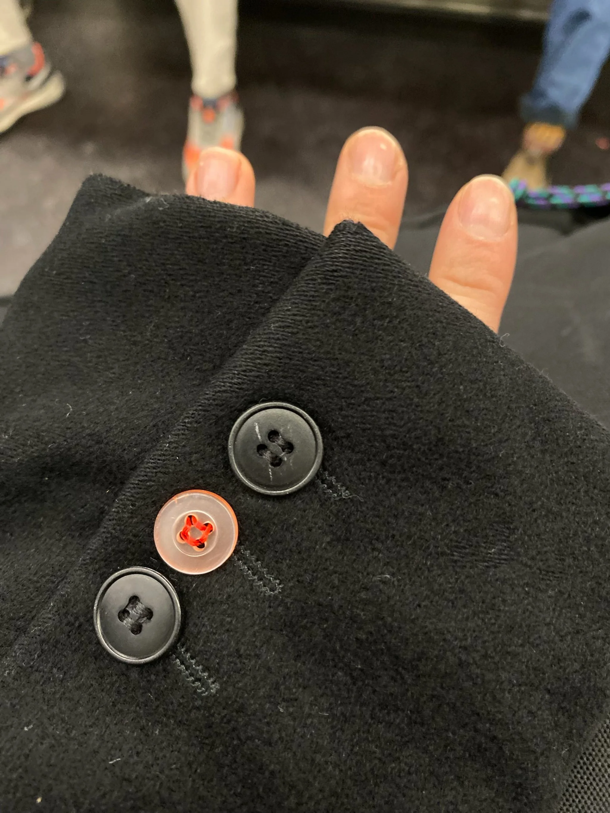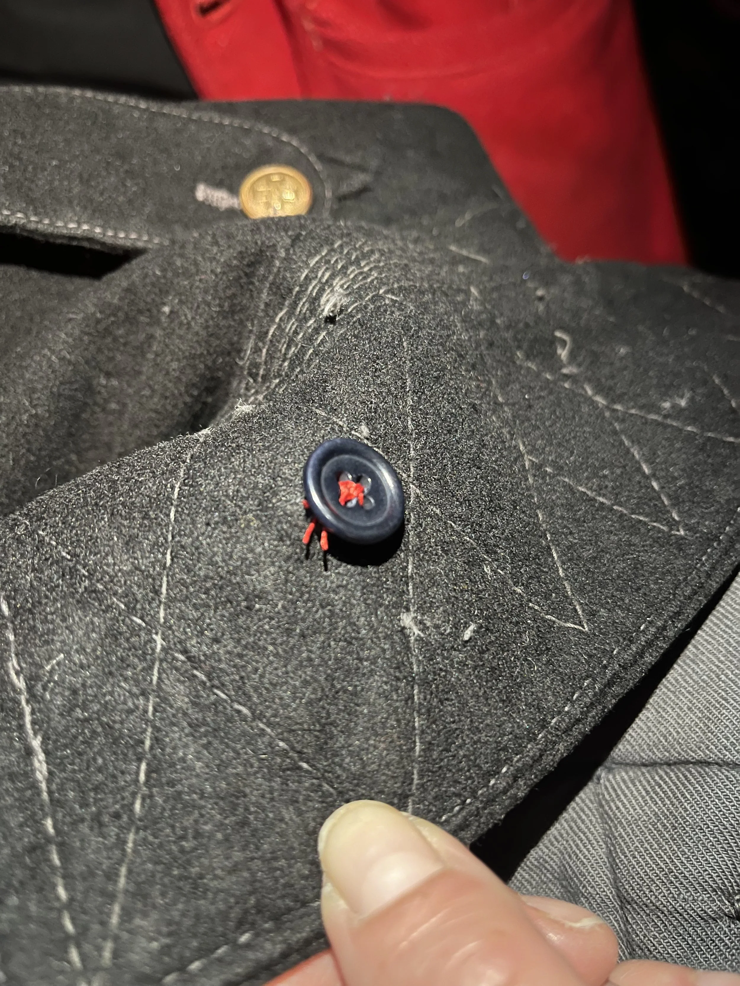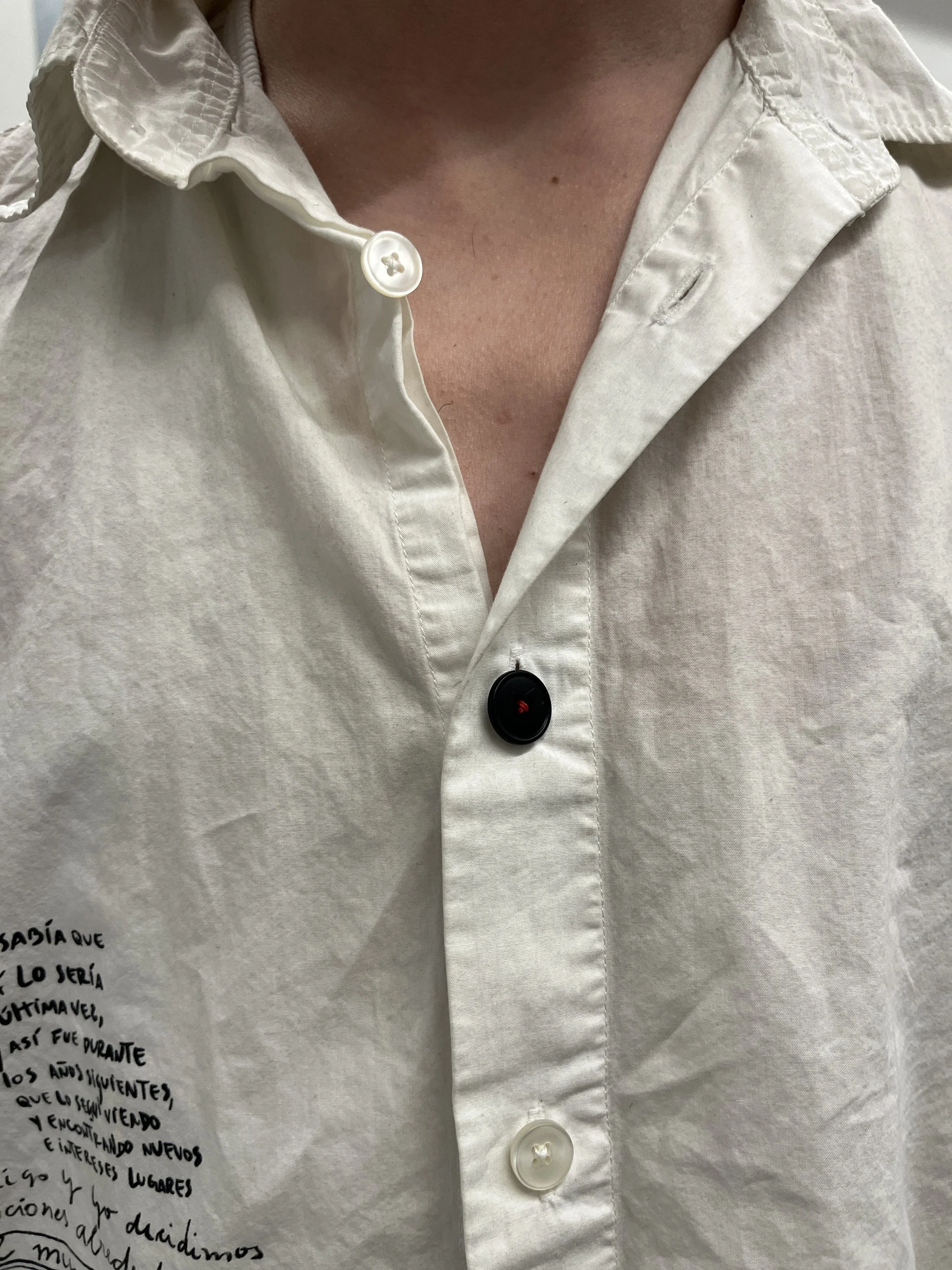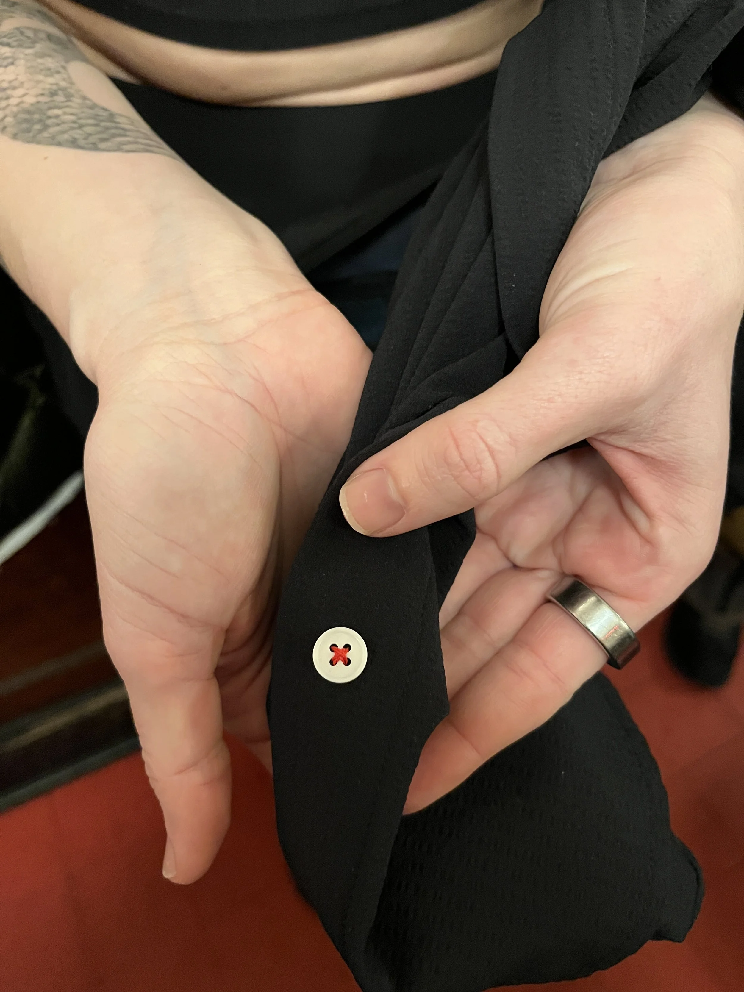 People were invited to participate by allowing one of the buttons on their clothing to be removed and replaced with a button from the previous participant. The new button is sewn on carefully with red thread. This process is repeated with the next participant. Sixty buttons were exchanged, one person at a time.