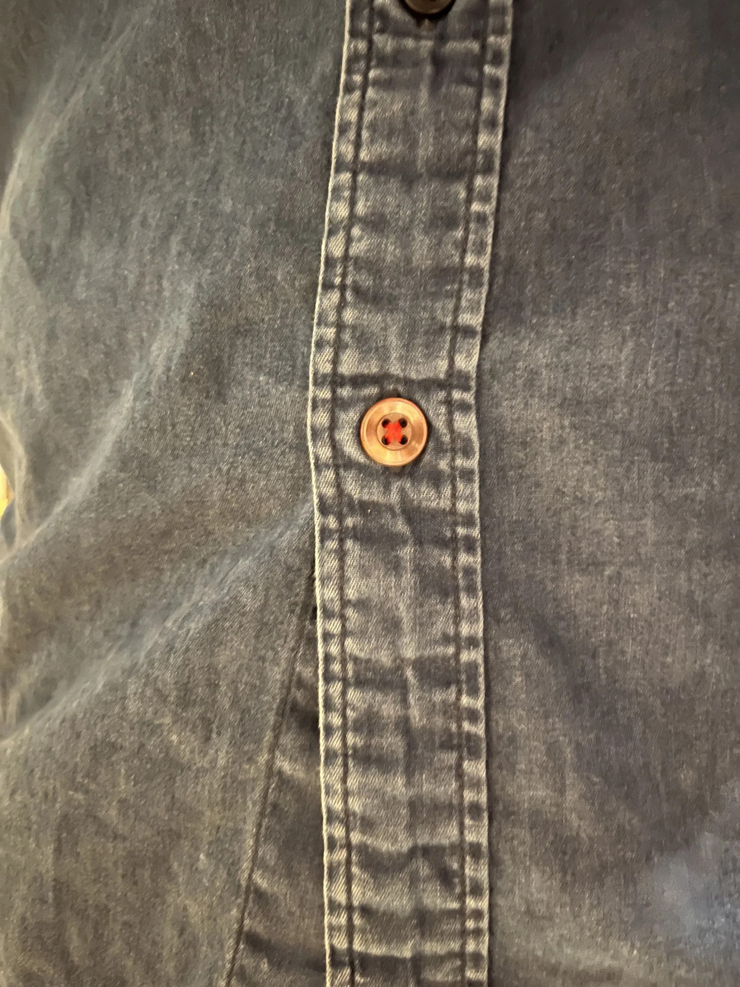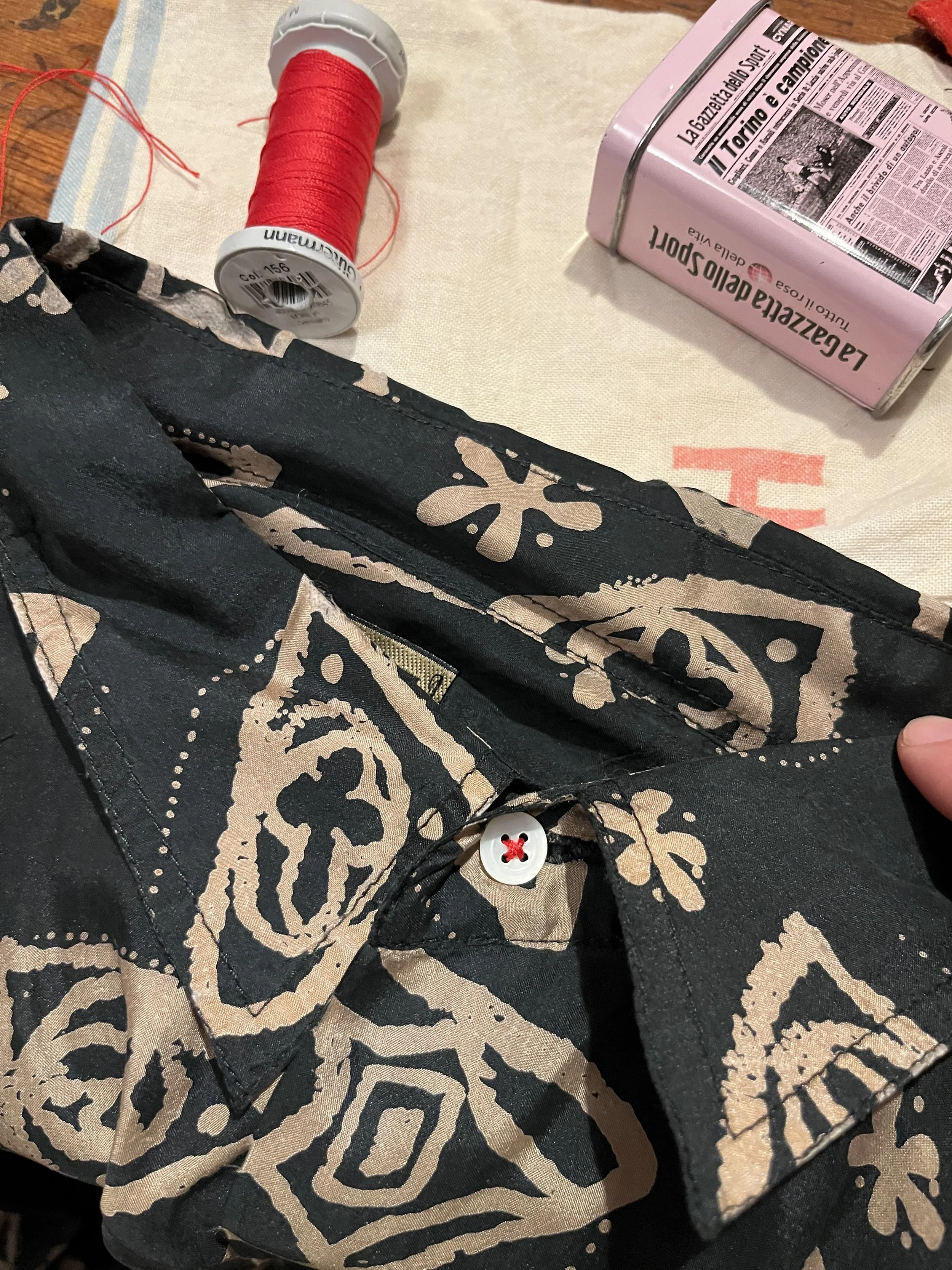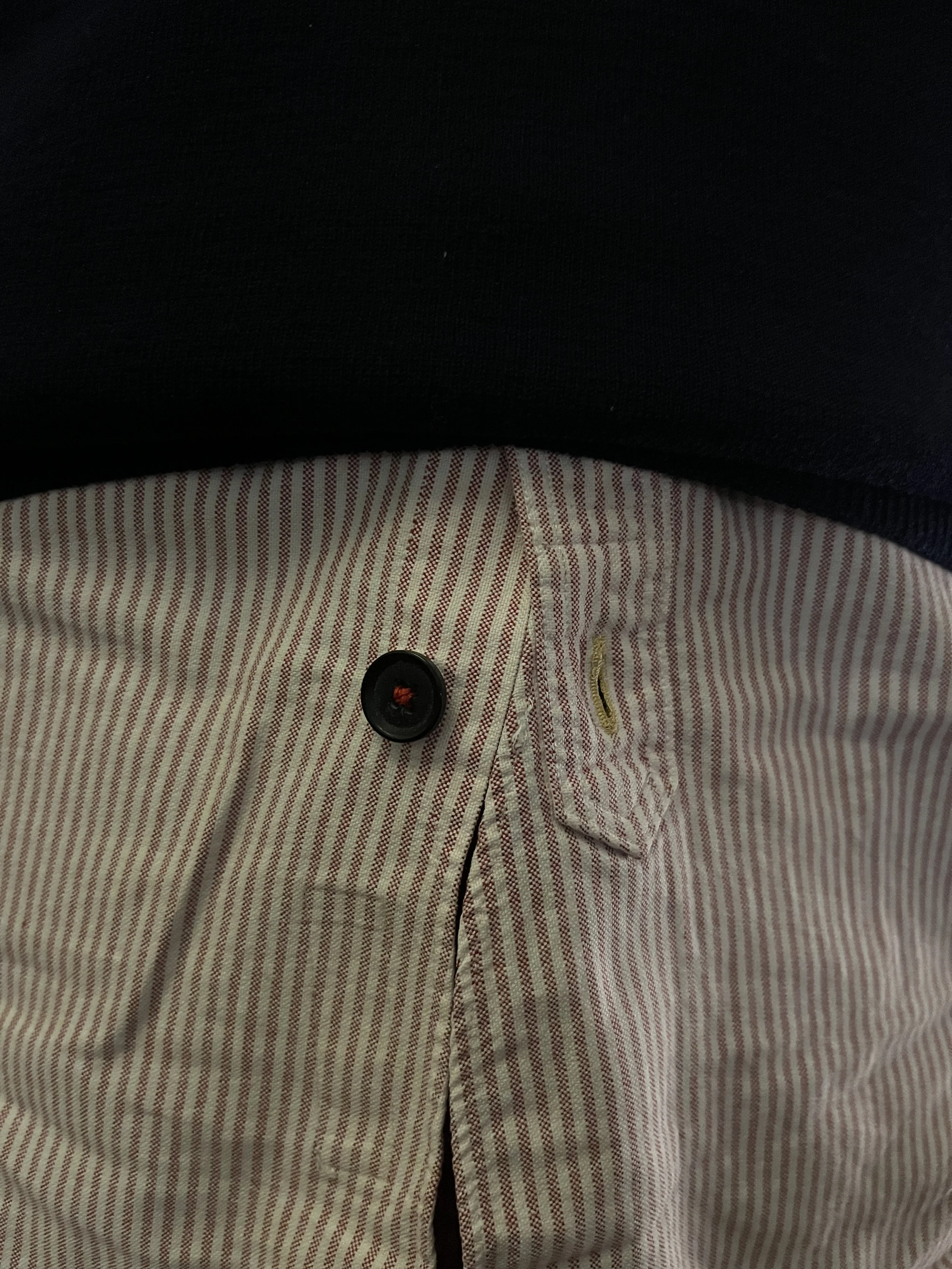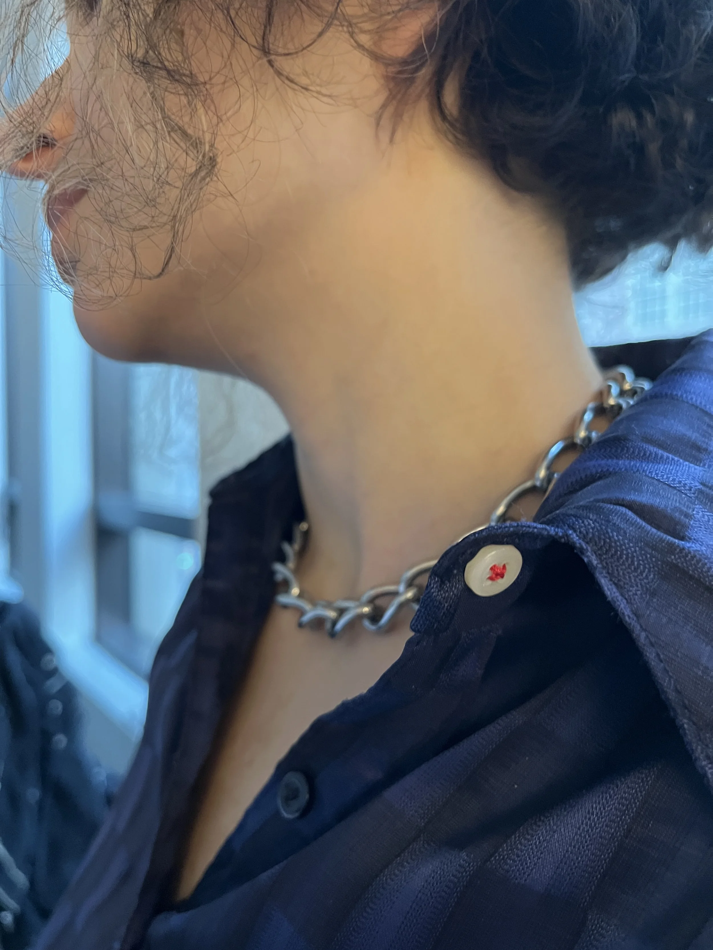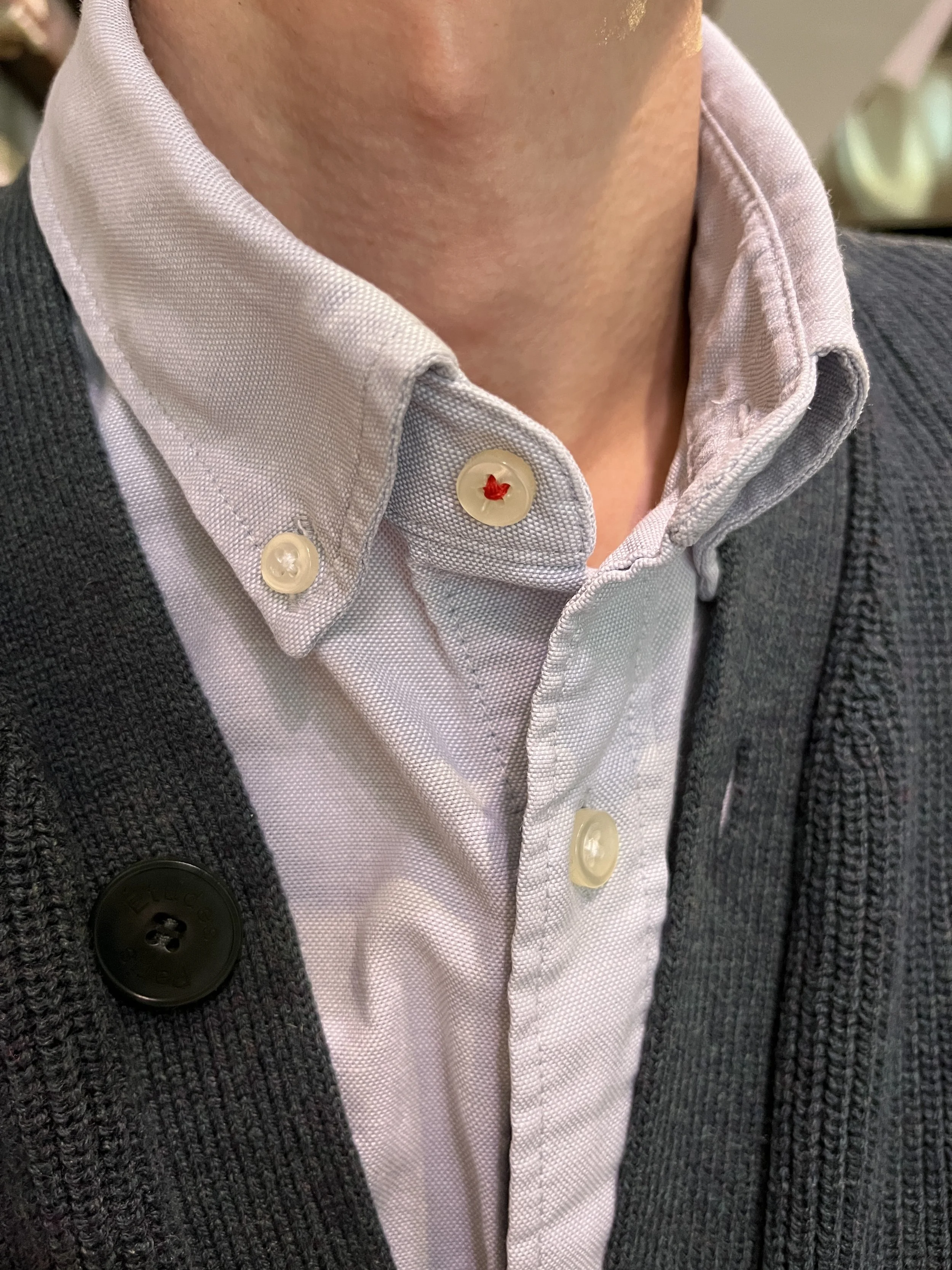 People were invited to participate by allowing one of the buttons on their clothing to be removed and replaced with a button from the previous participant. The new button is sewn on carefully with red thread. This process is repeated with the next participant. Sixty buttons were exchanged, one person at a time.