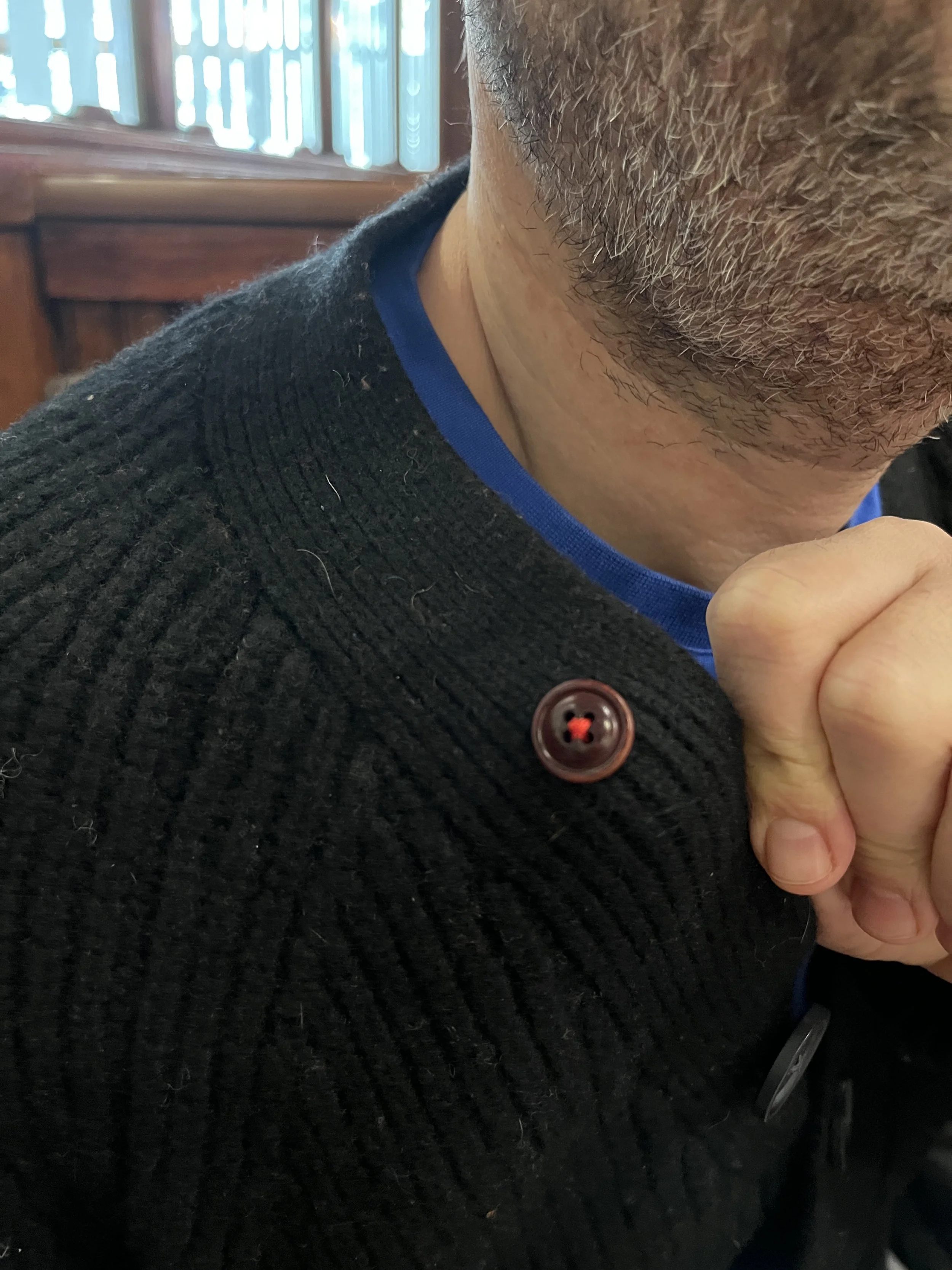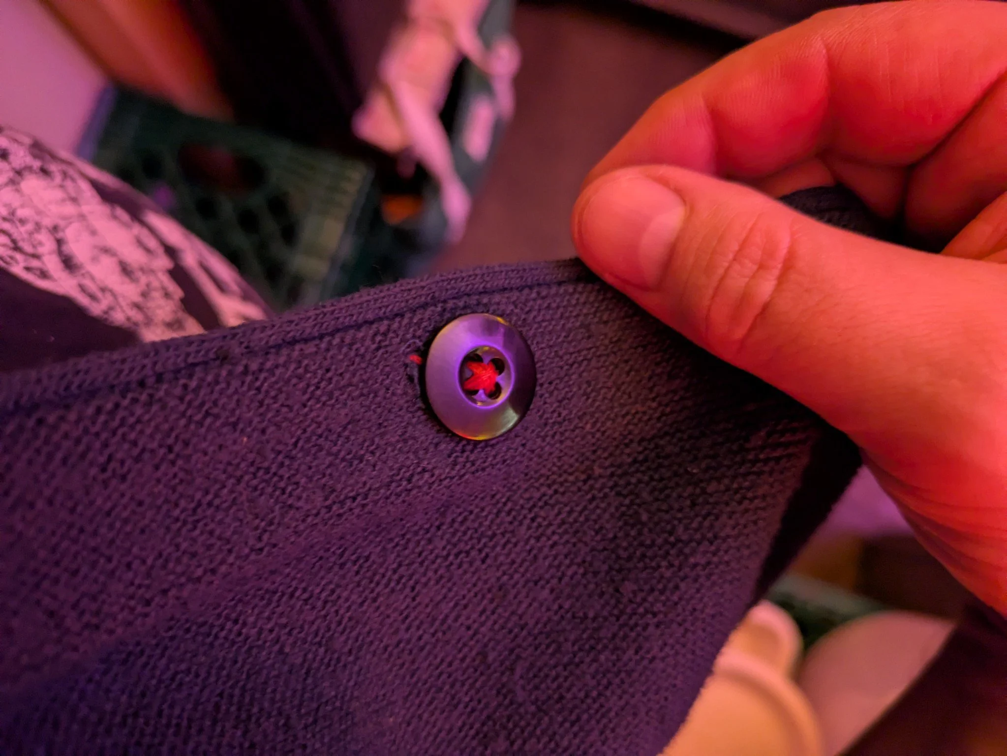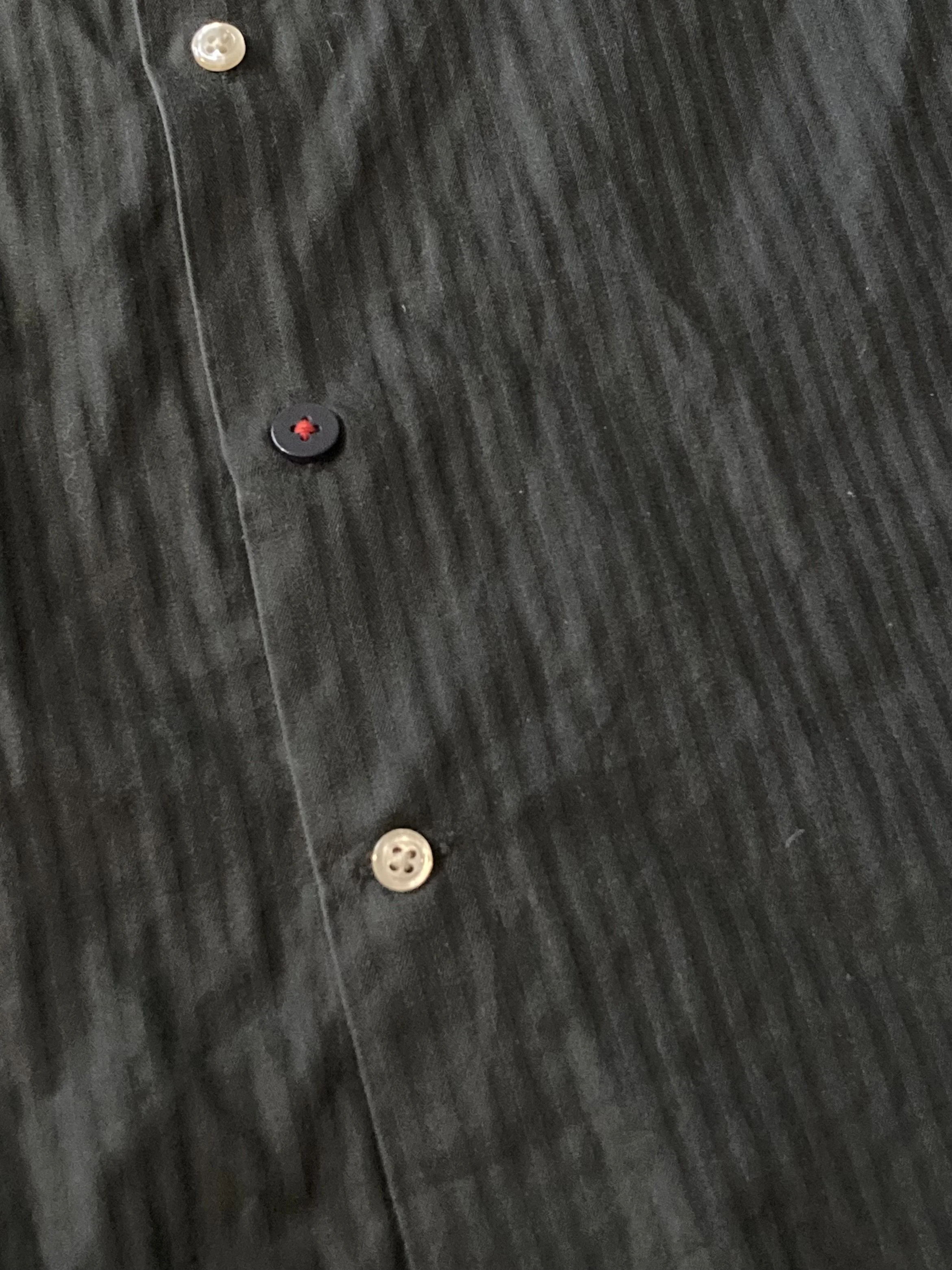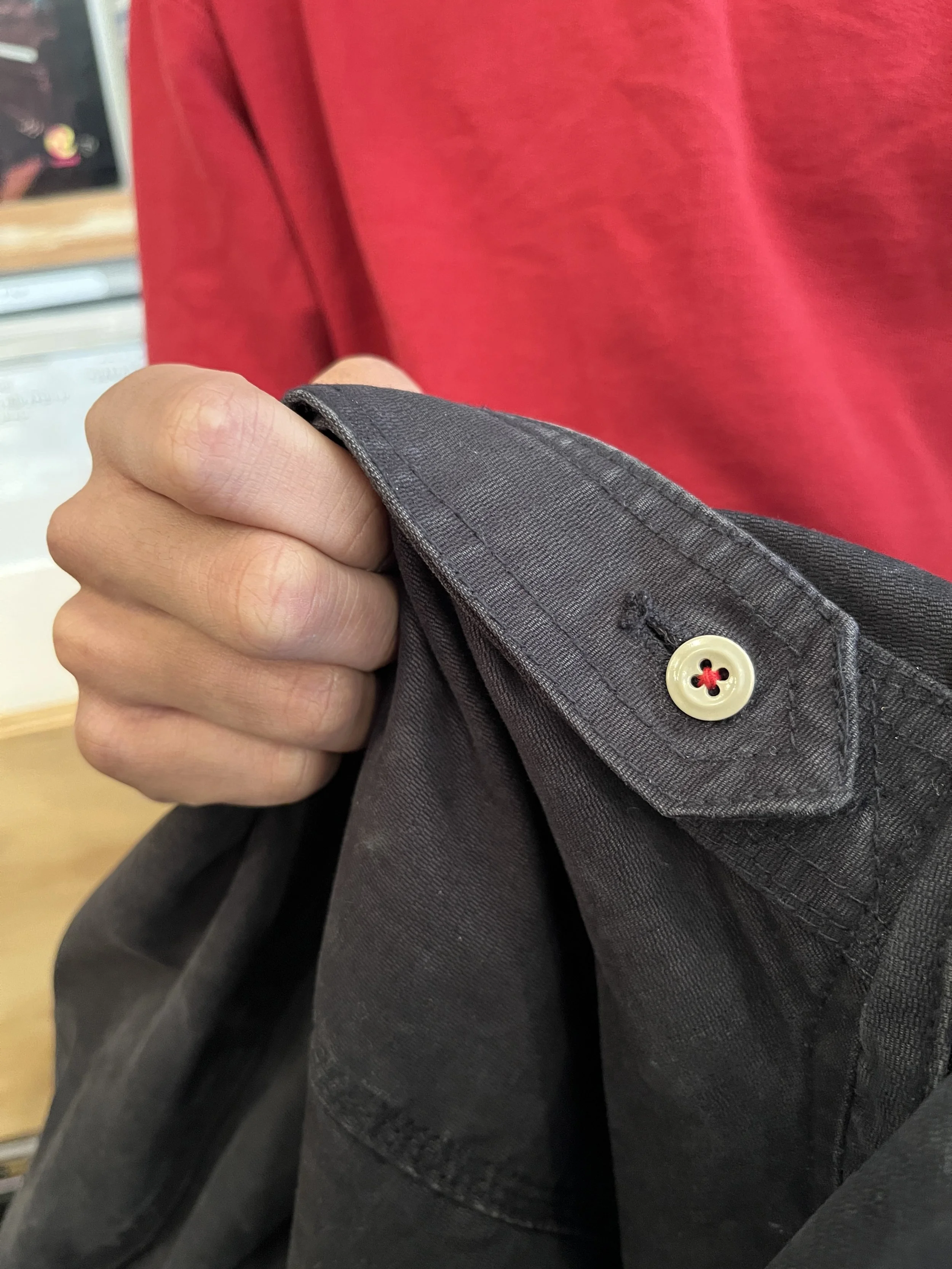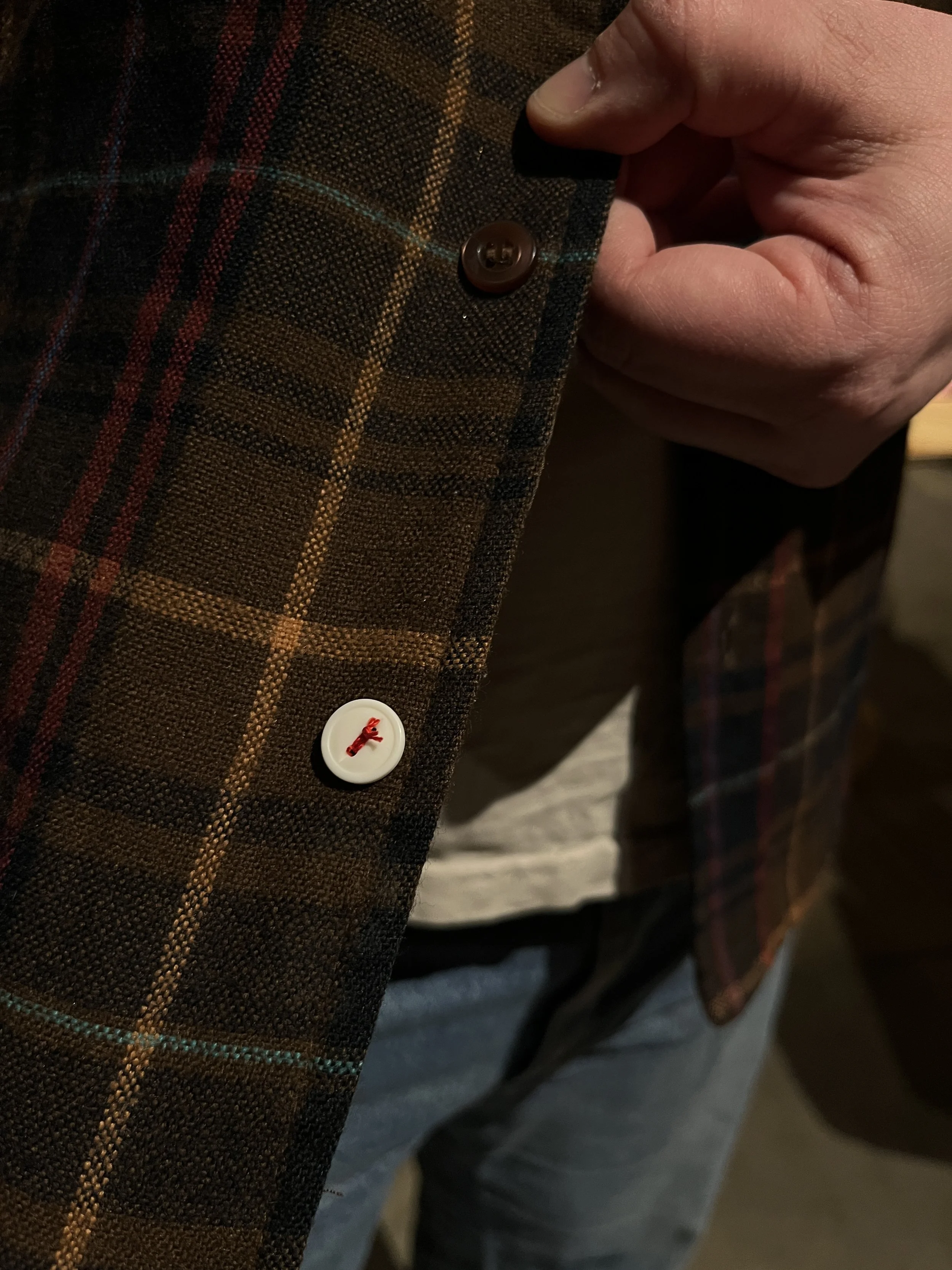People were invited to participate by allowing one of the buttons on their clothing to be removed and replaced with a button from the previous participant. The new button is sewn on carefully with red thread. This process is repeated with the next participant. Sixty buttons were exchanged, one person at a time.