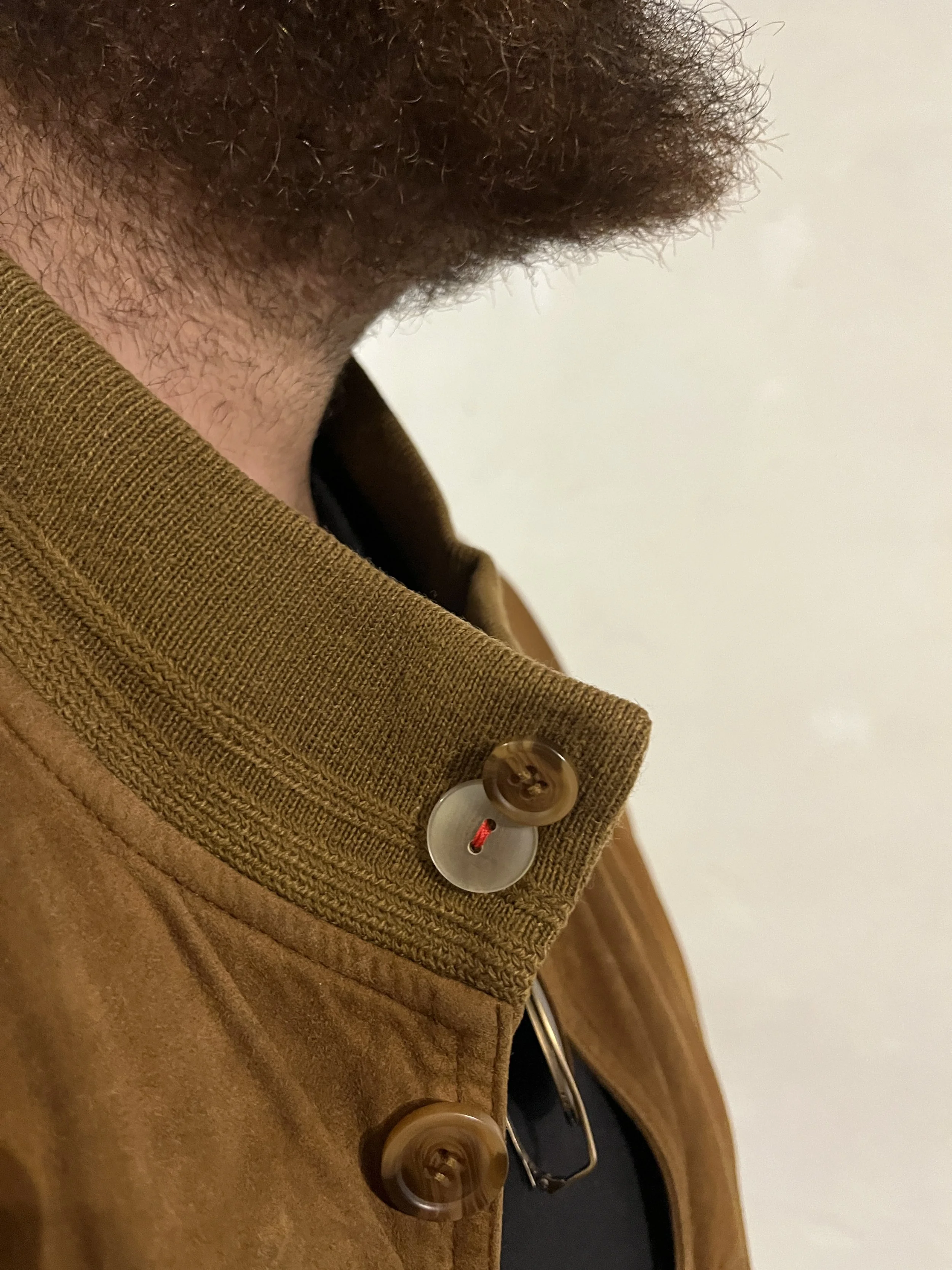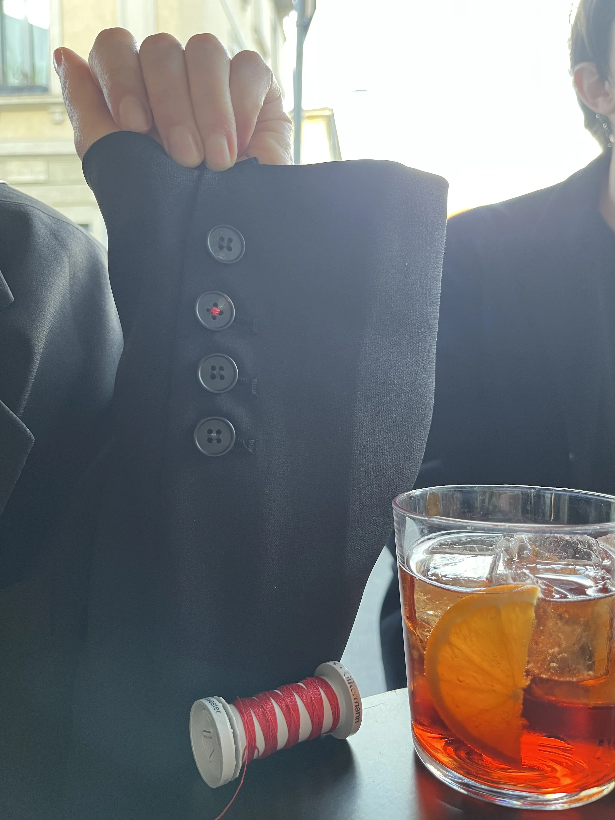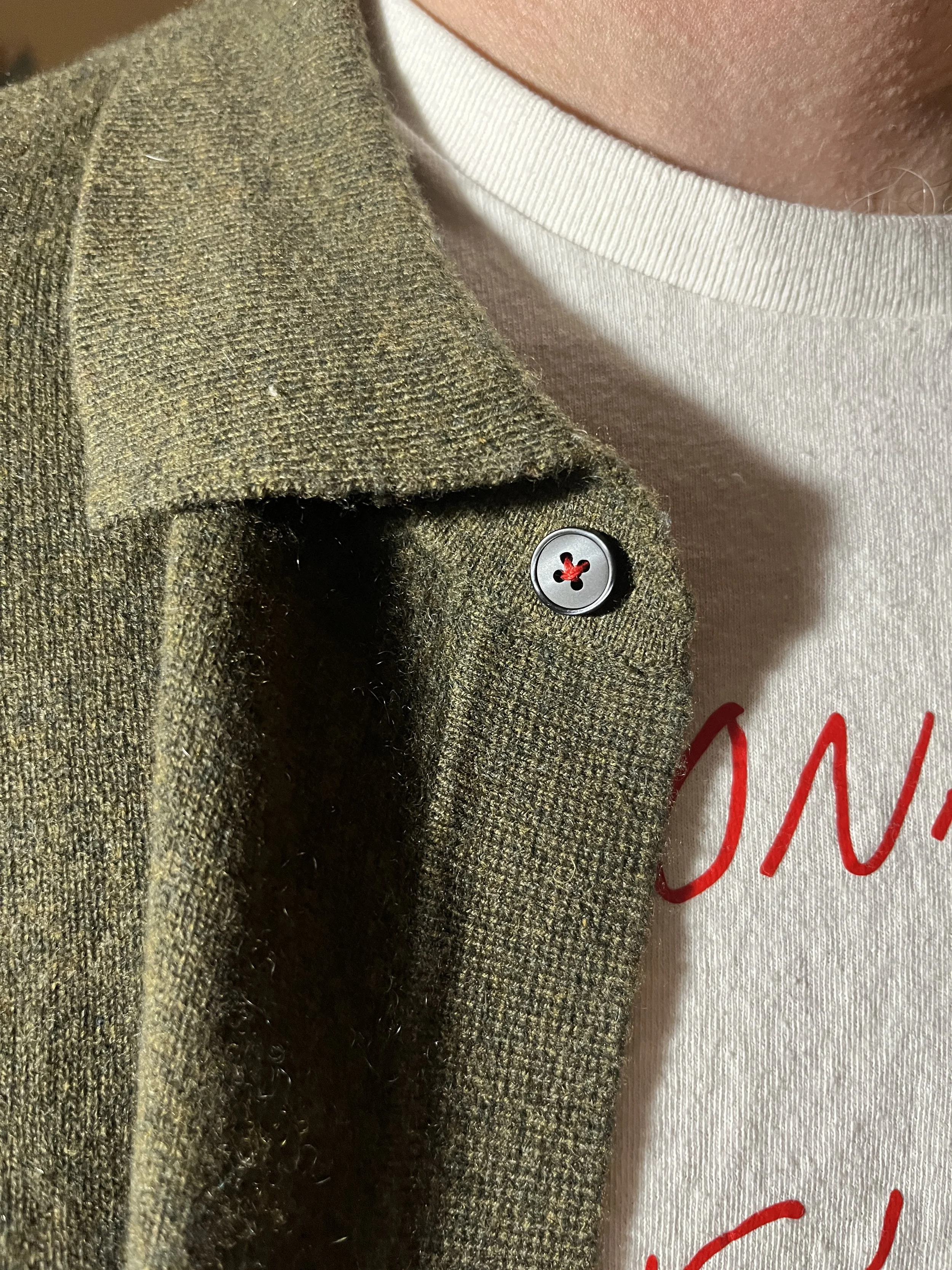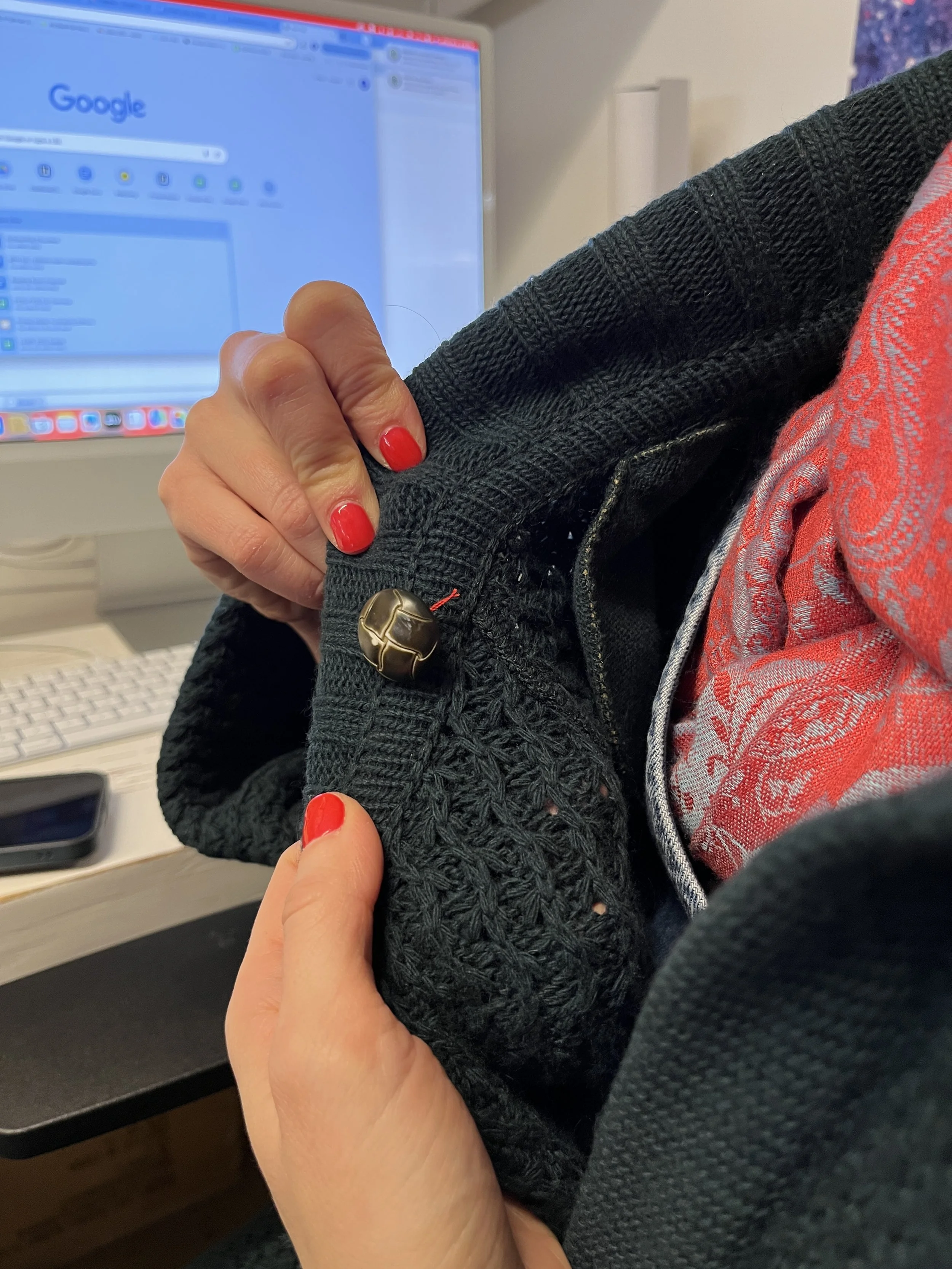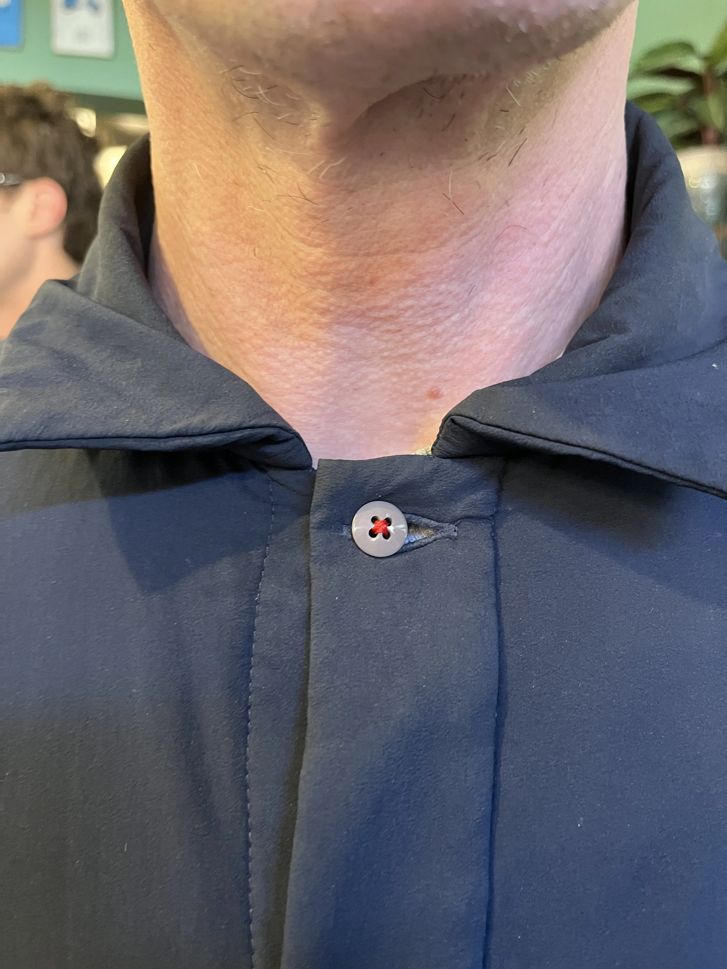 People were invited to participate by allowing one of the buttons on their clothing to be removed and replaced with a button from the previous participant. The new button is sewn on carefully with red thread. This process is repeated with the next participant. Sixty buttons were exchanged, one person at a time.