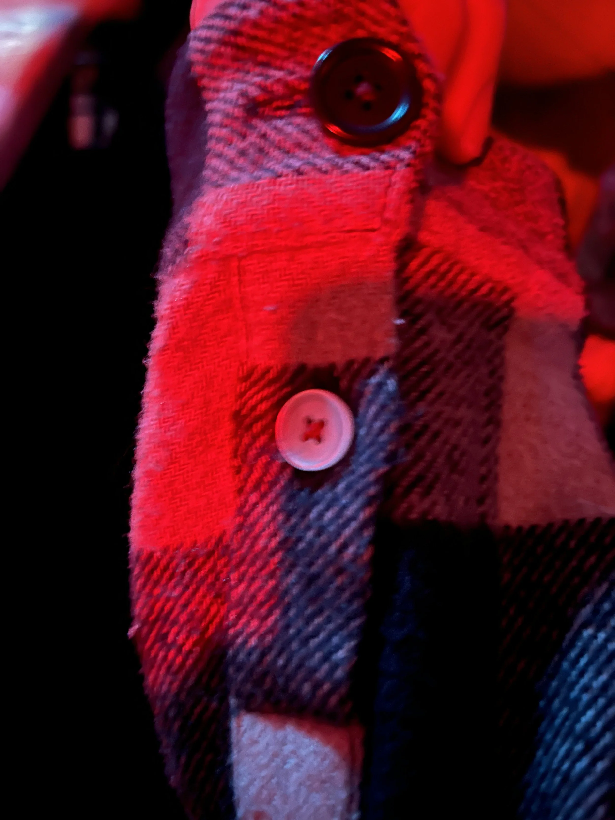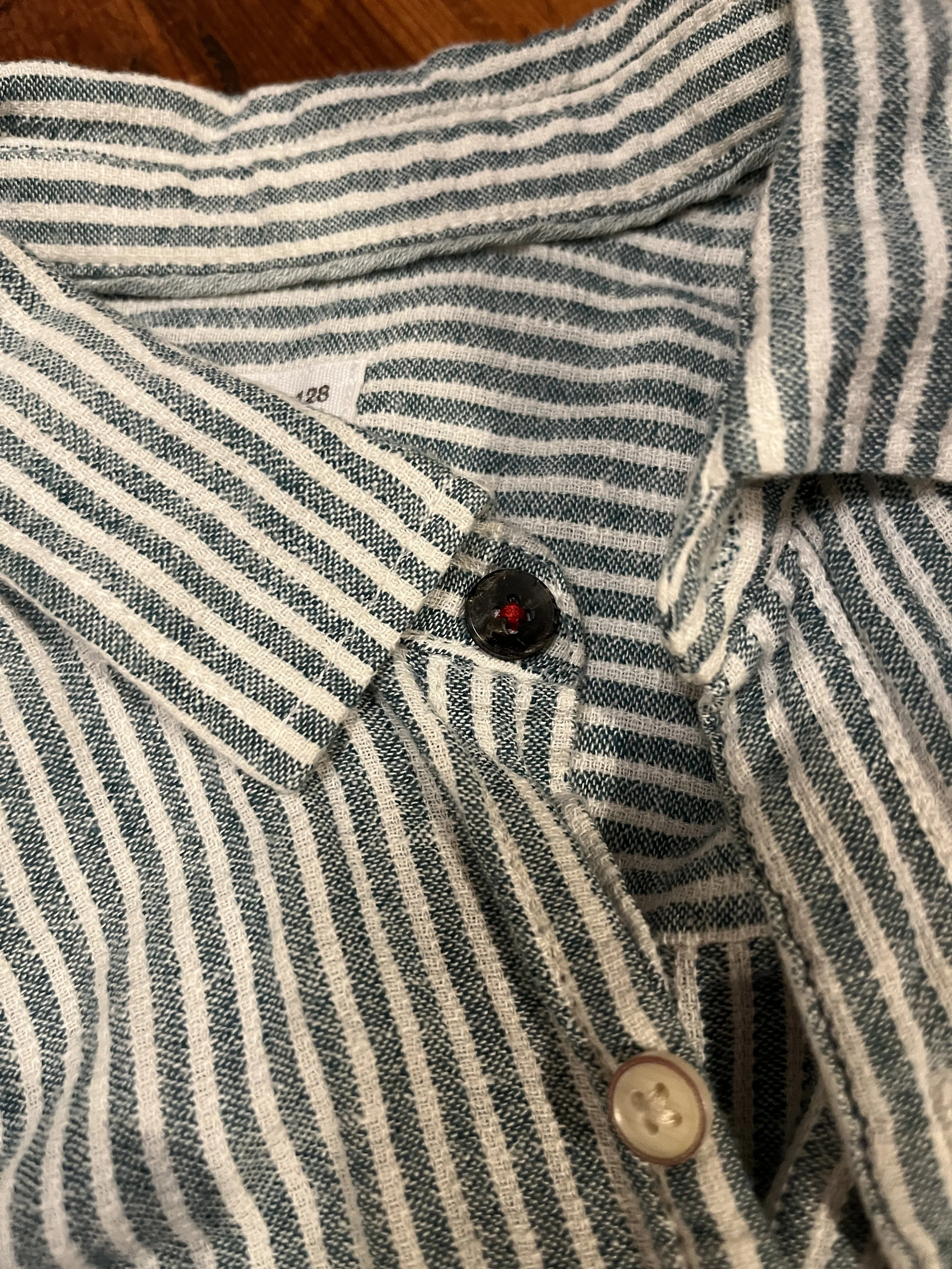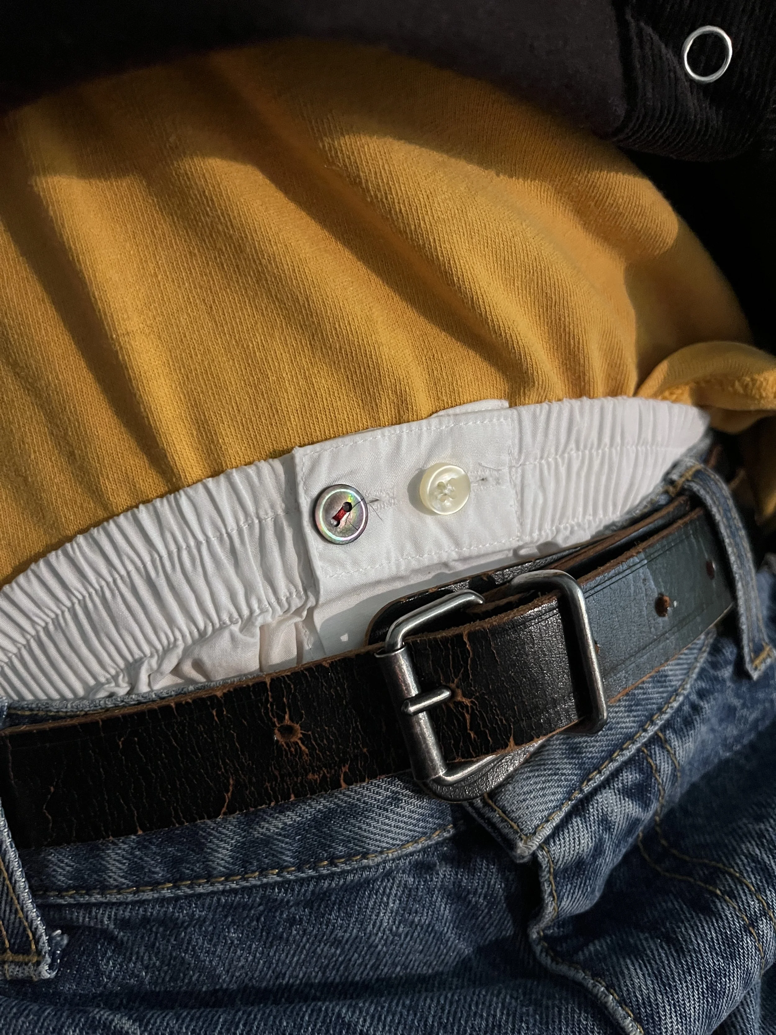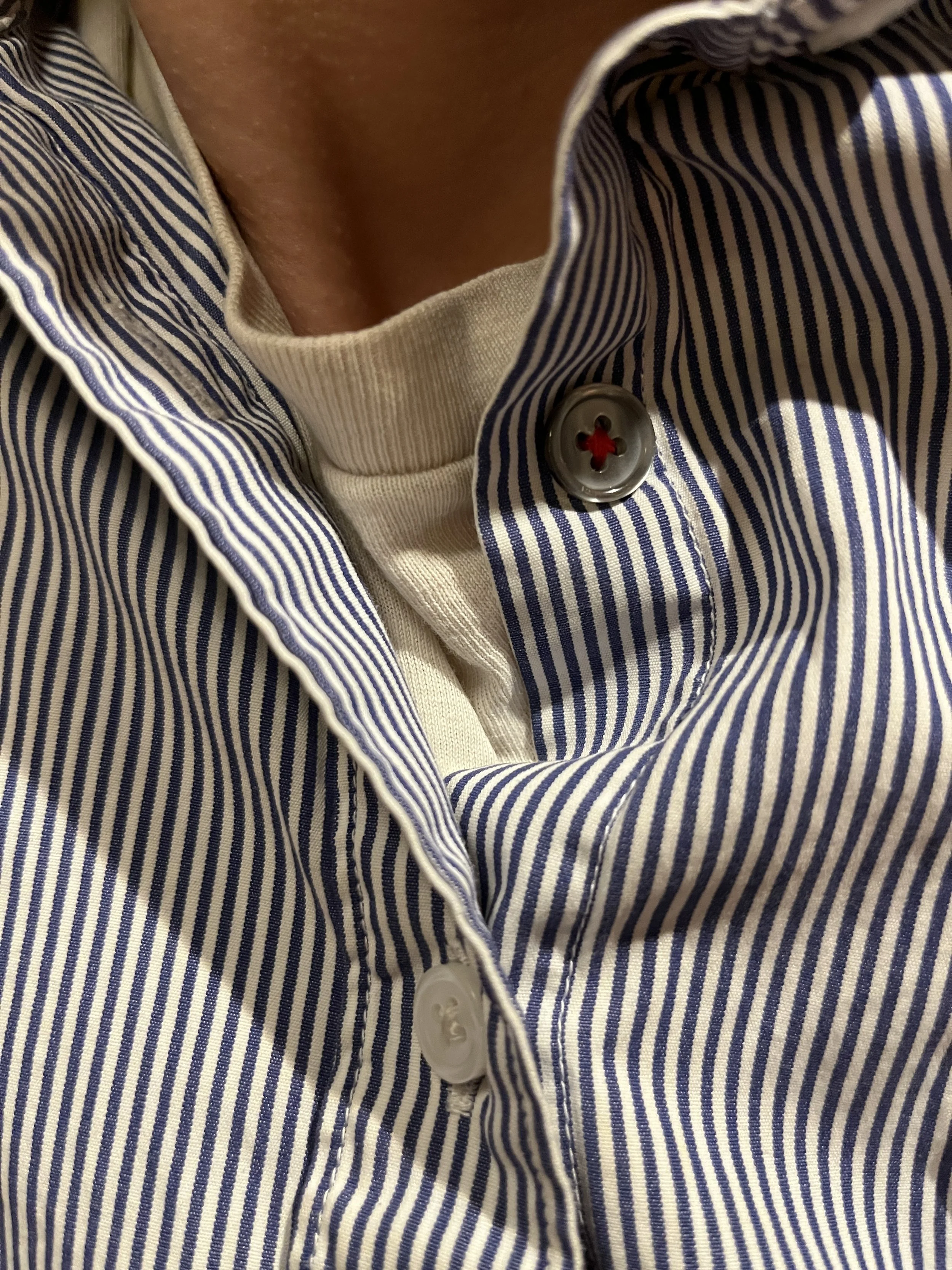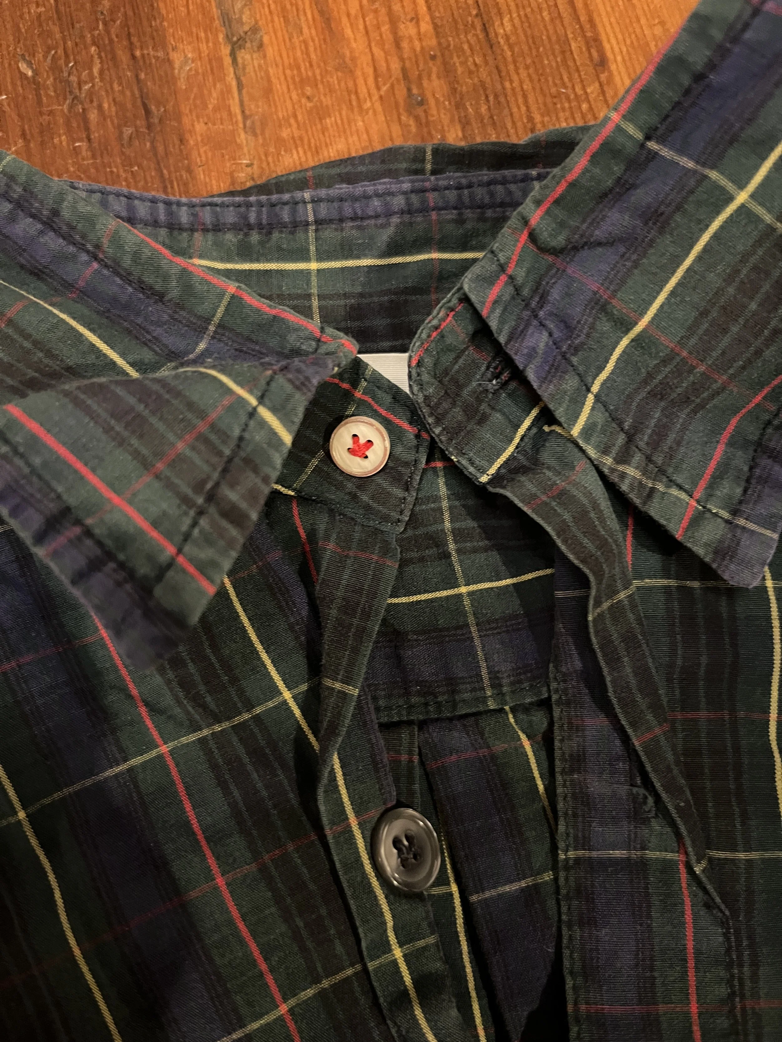 People were invited to participate by allowing one of the buttons on their clothing to be removed and replaced with a button from the previous participant. The new button is sewn on carefully with red thread. This process is repeated with the next participant. Sixty buttons were exchanged, one person at a time.