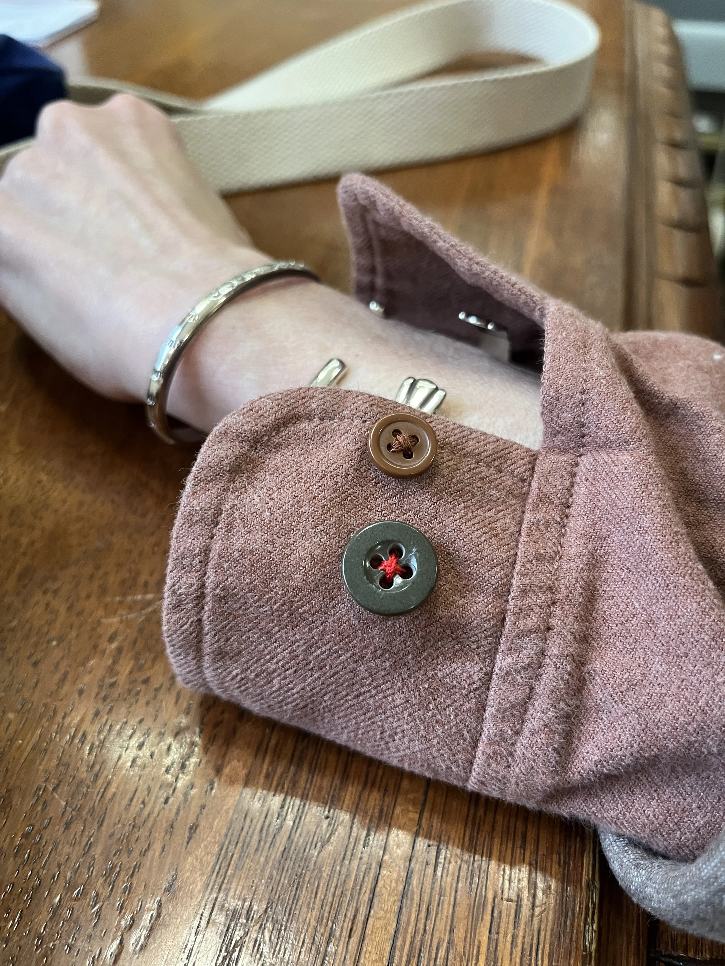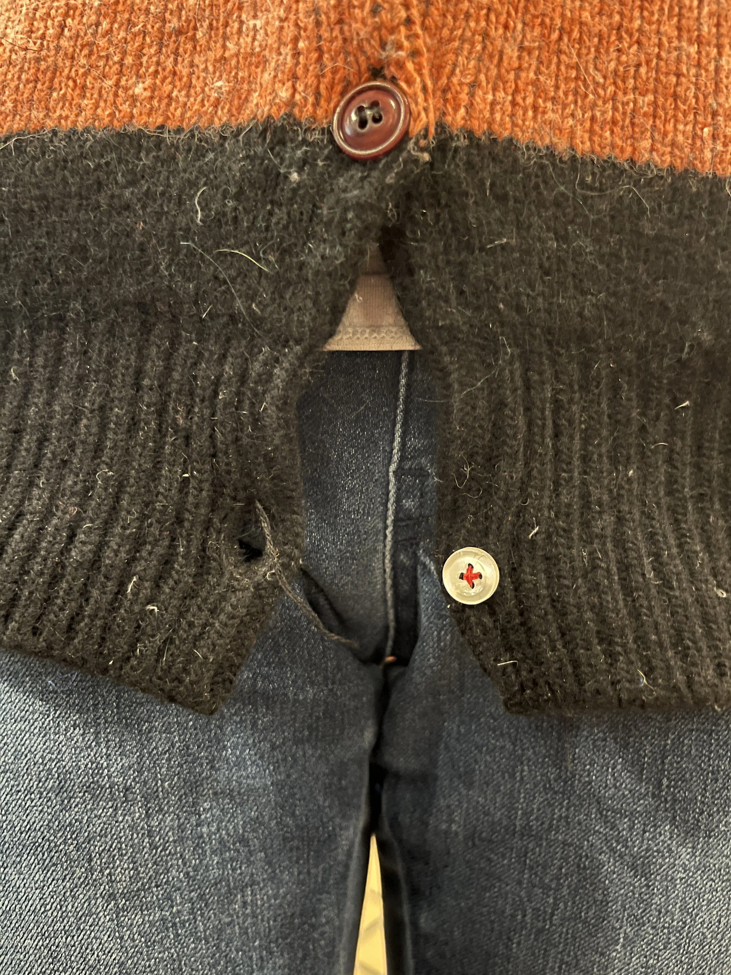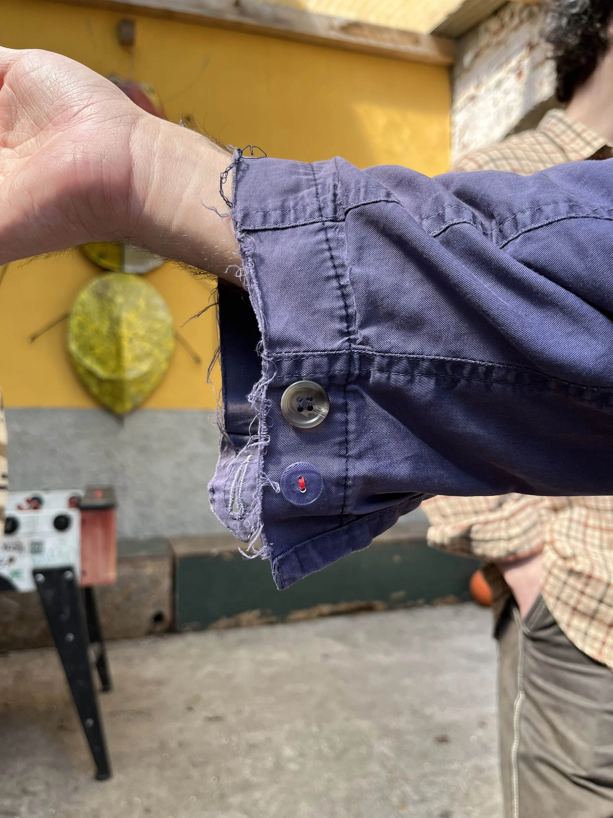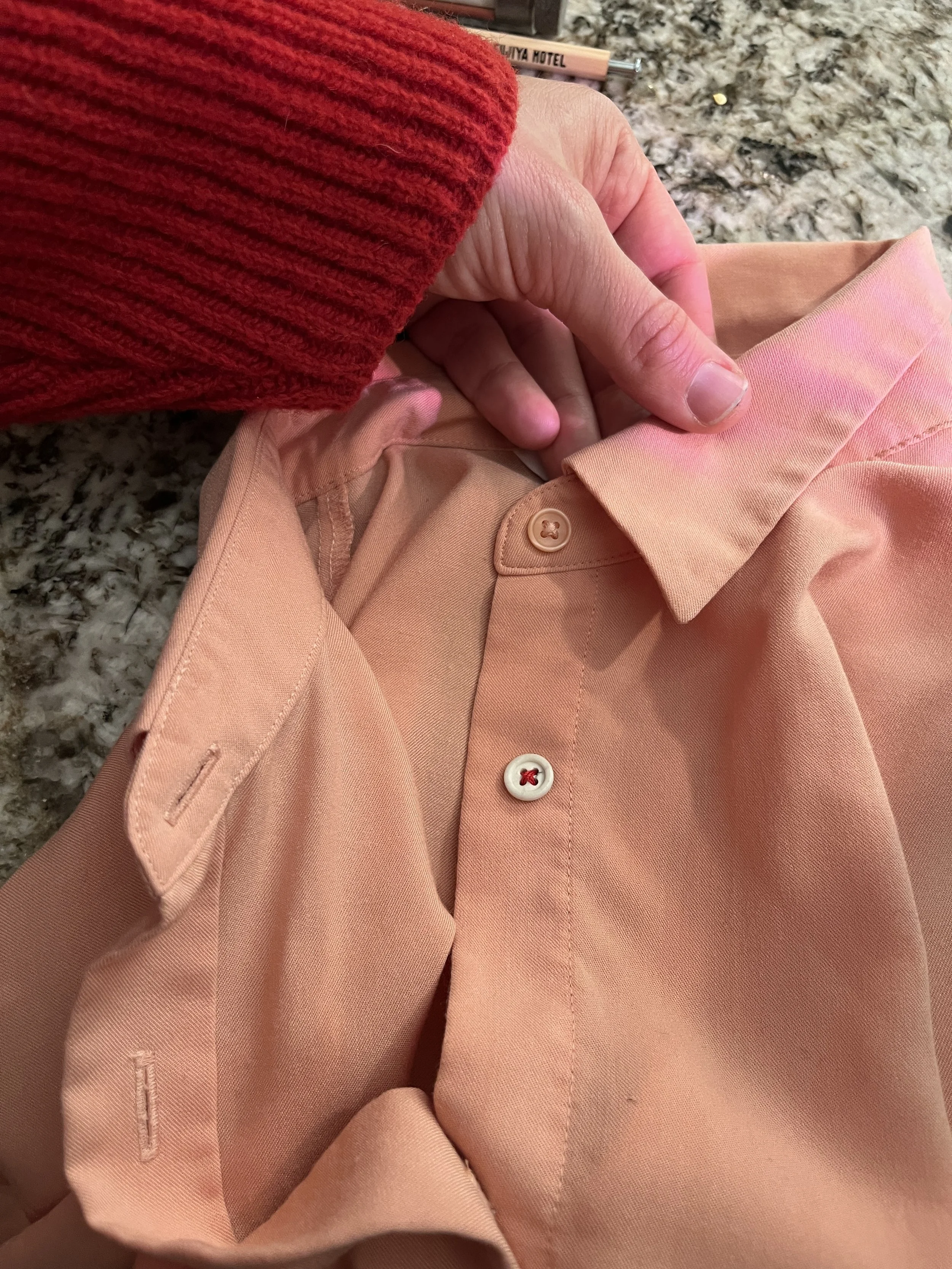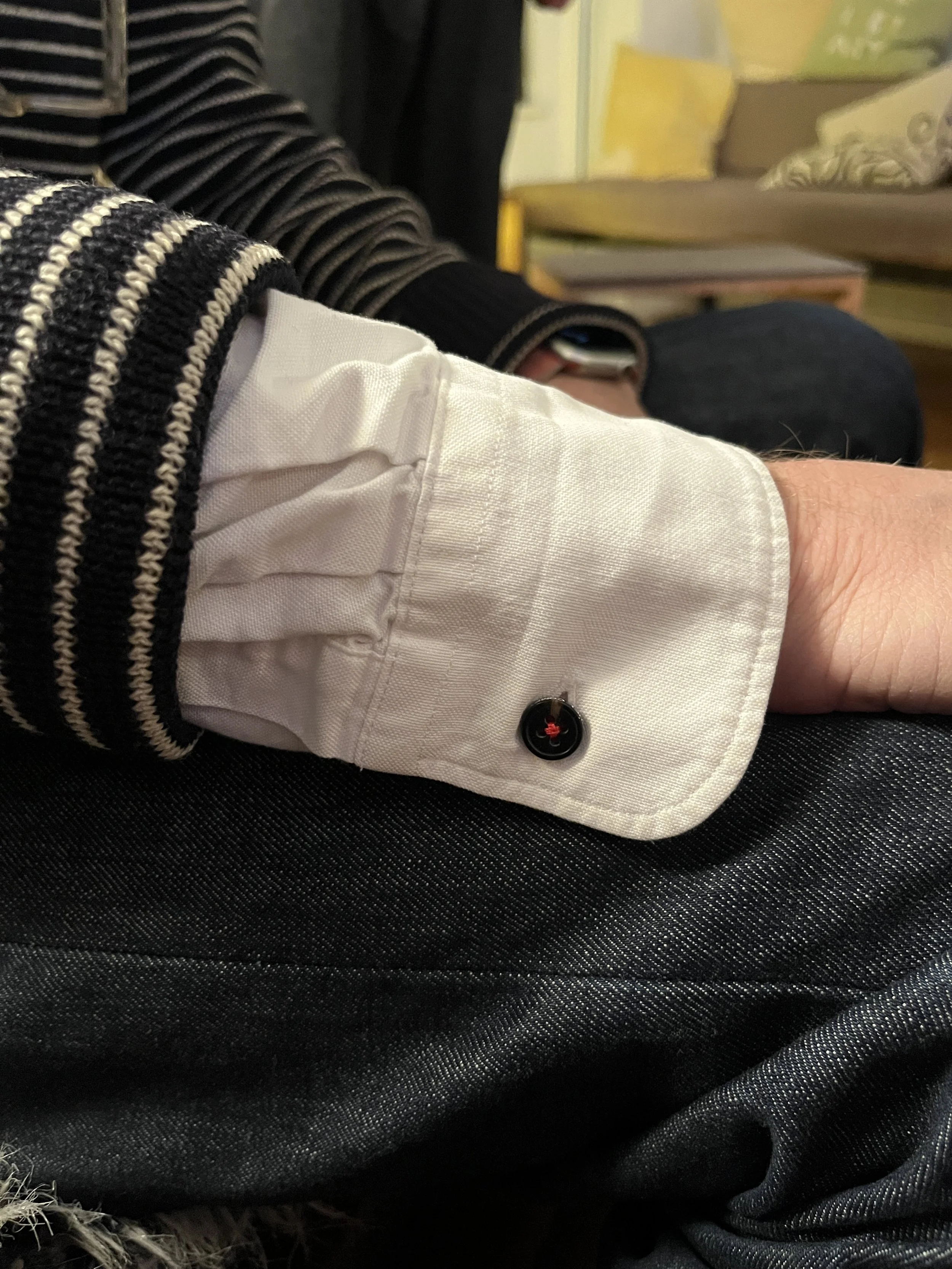 People were invited to participate by allowing one of the buttons on their clothing to be removed and replaced with a button from the previous participant. The new button is sewn on carefully with red thread. This process is repeated with the next participant. Sixty buttons were exchanged, one person at a time.